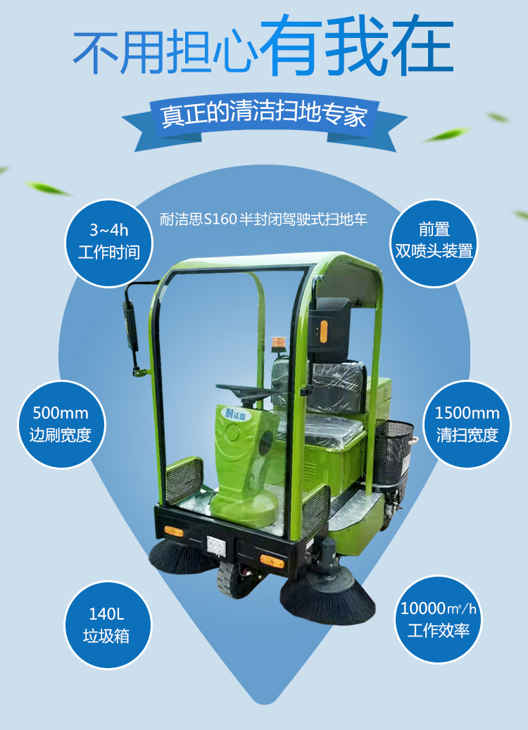 耐潔思S160半封閉駕駛式掃地車主要針對戶外街道、馬路、小區物業、工廠室內外地面、大型商場外圍、火車站、汽車站、大型物業廣場、機場外圍等公共場所地面的日常垃圾清掃及保潔工作。